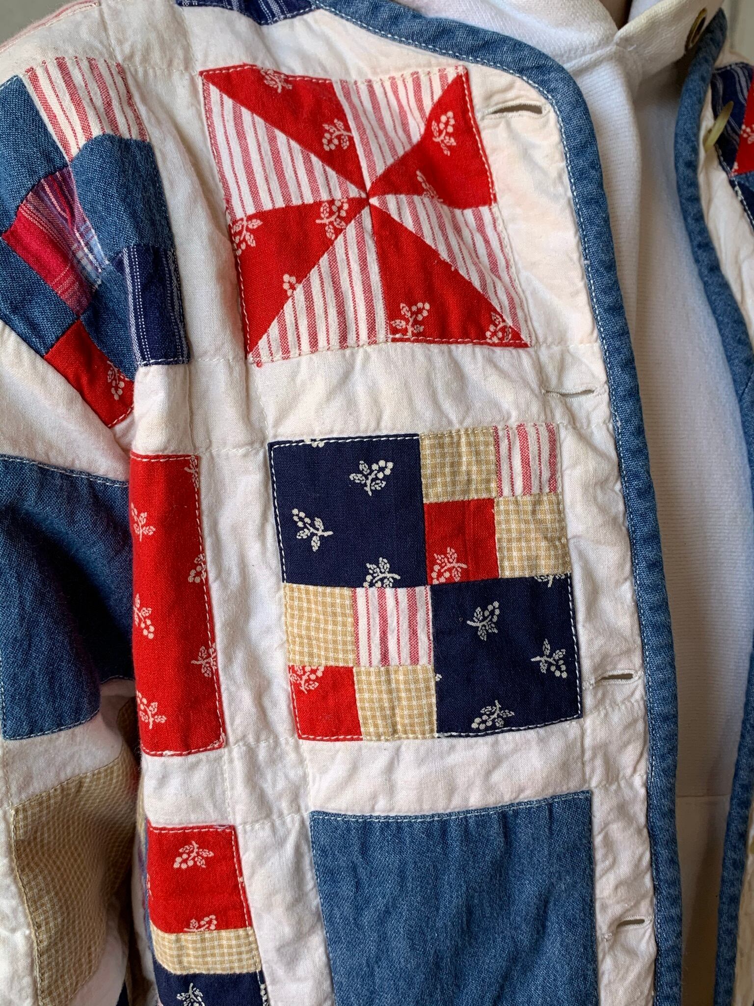 デニムやチェック等の様々な生地のパッチワークが施された大変可愛らしいキルティングジャケットです。