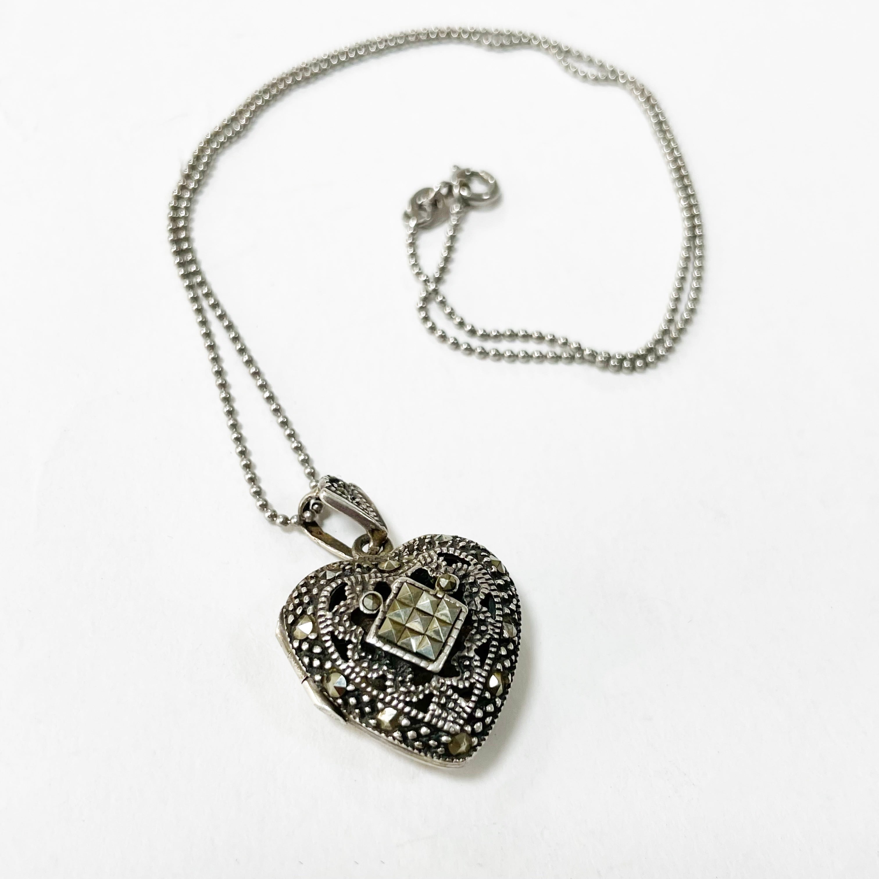 マーカサイトが散りばめられた925シルバーのロケットペンダントです。