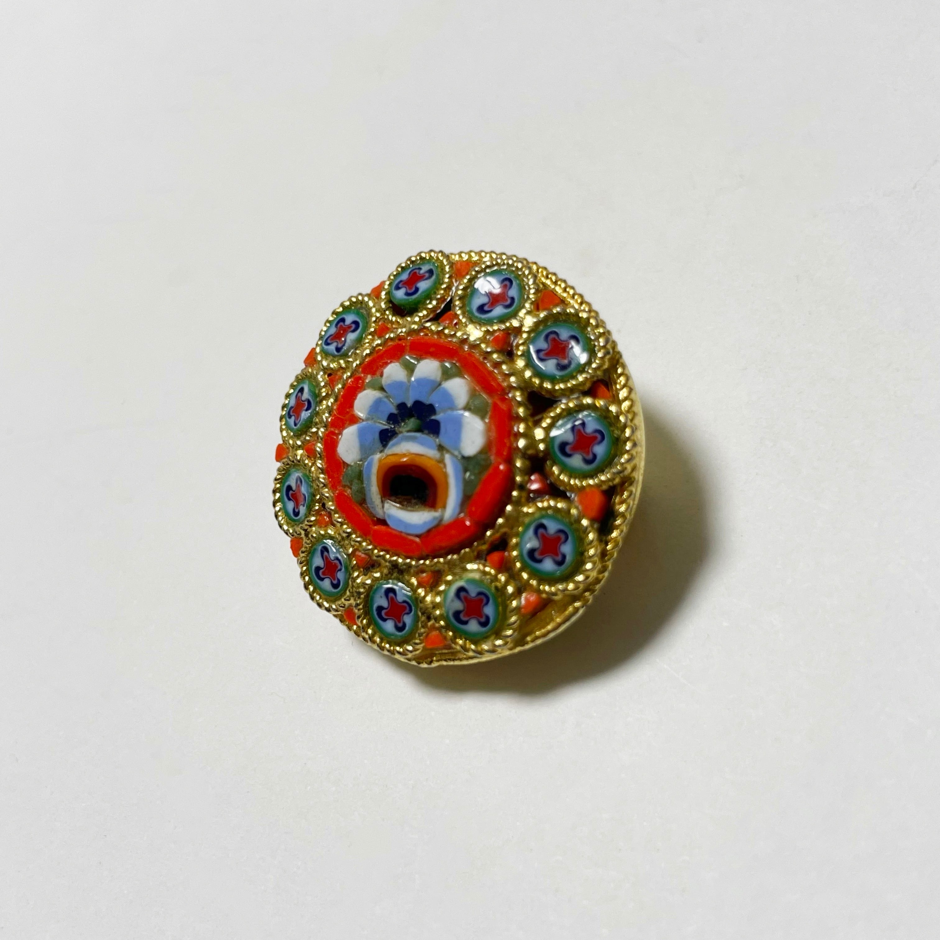 手作りのガラスパーツをびっしりと嵌め込み図柄を作る、イタリアの伝統工芸マイクロモザイクによる美しいアンティークブローチです。