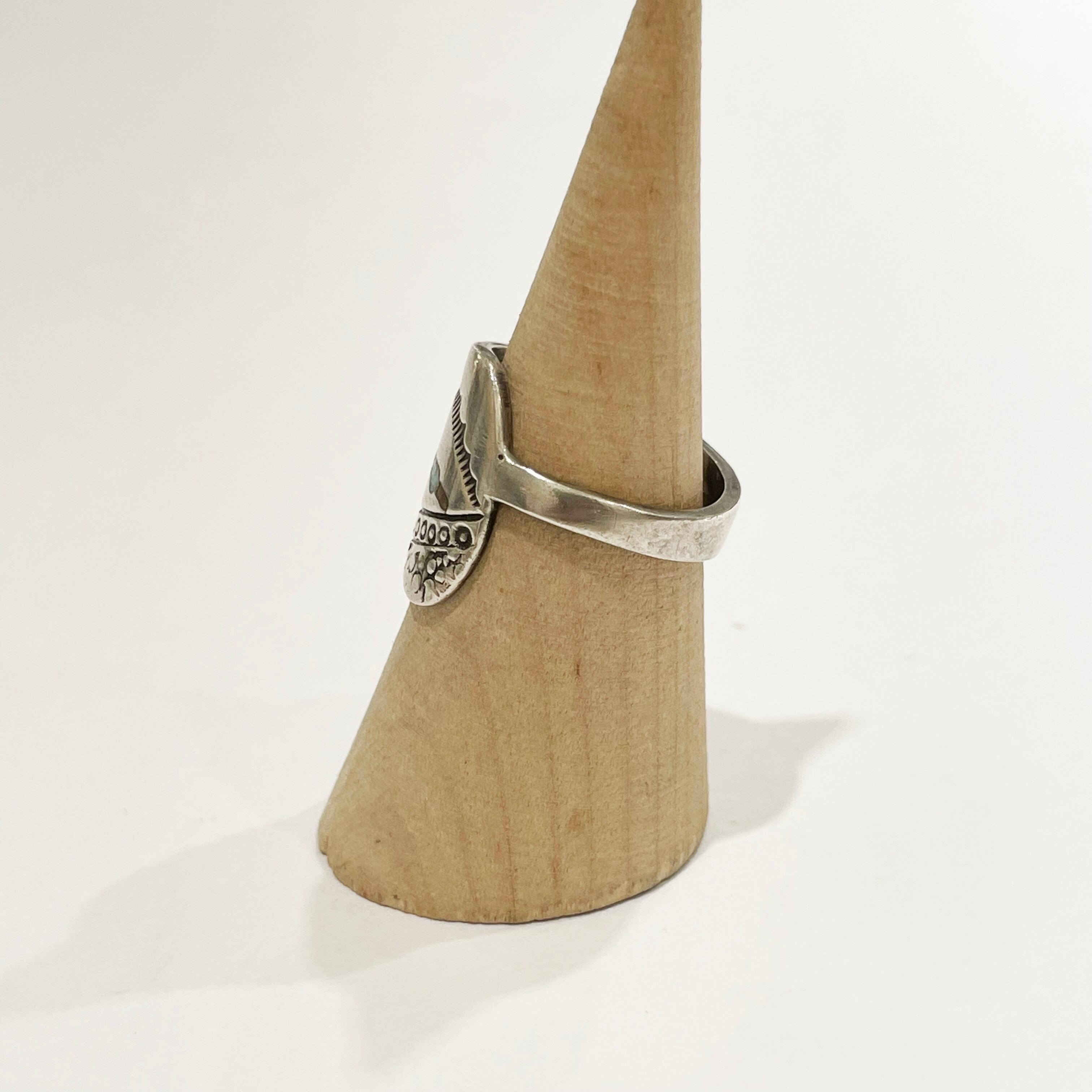 こちらのリングはそんなペヨーテバードのデザインにターコイズとコーラルのチップがインレイされ、さらにその周りにはスタンプが打ち込まれた手の込んだリングです。