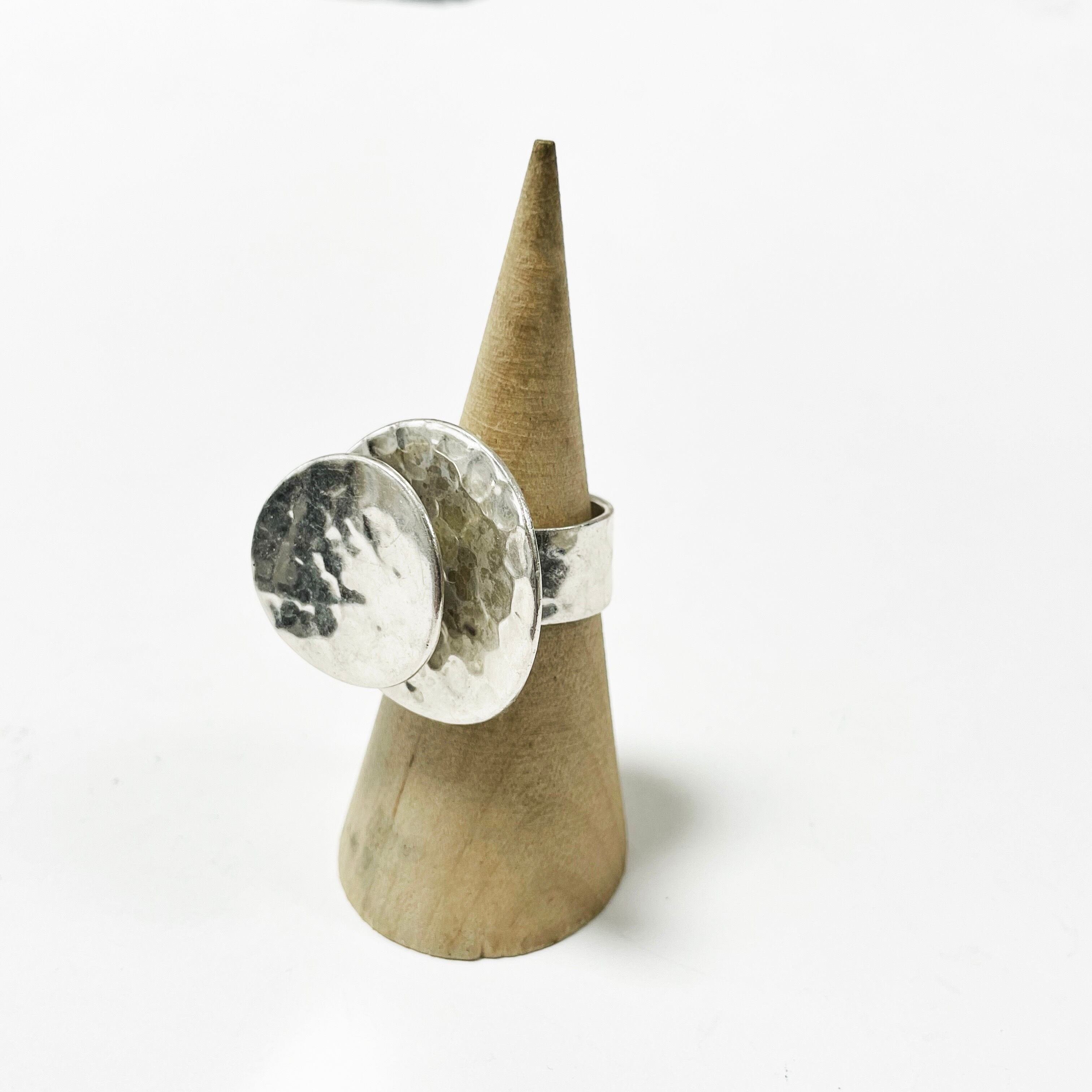 メキシコ製925シルバーのヴィンテージリングです。 モダンなデザインがかなりイカしてます。 槌目状のテクスチャーも効いてます。 裏に925とMexicoの刻印が確認できます。 こちらは80's〜90's頃のヴィンテージです。 Weight*約14.6g Size*約13号 Condition*特に目立つダメージや汚れはなく良い状態です。 あくまで年代物ですので神経質な方や新品の様なものをお求めの方はご購入をお控え下さいませ。