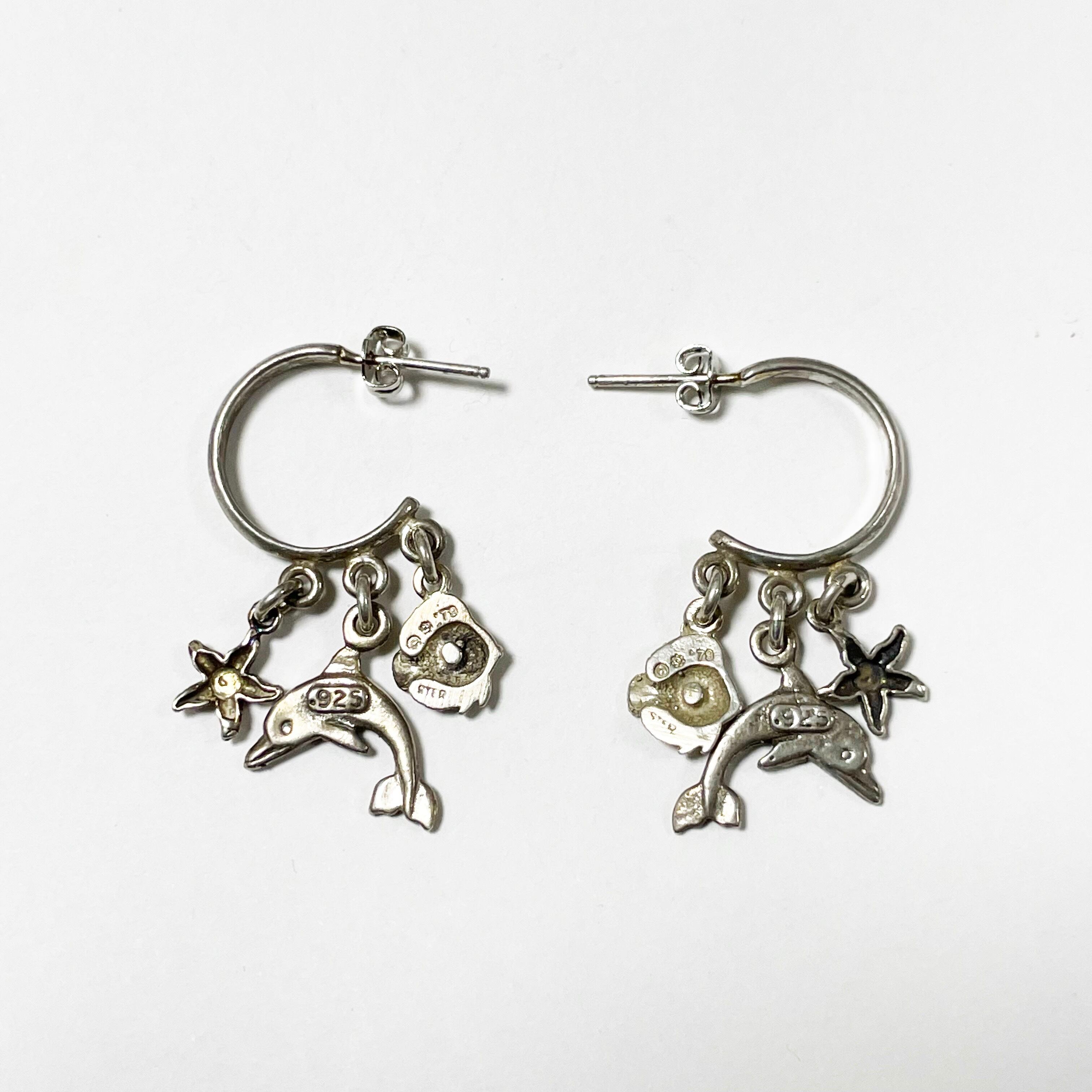 小さなチャームが揺れ動き、めっちゃ可愛いです。 フープの裏にOT925、イルカの裏に925、魚の裏にSTERと'79とコピーライトマークと何かマークが入っています。