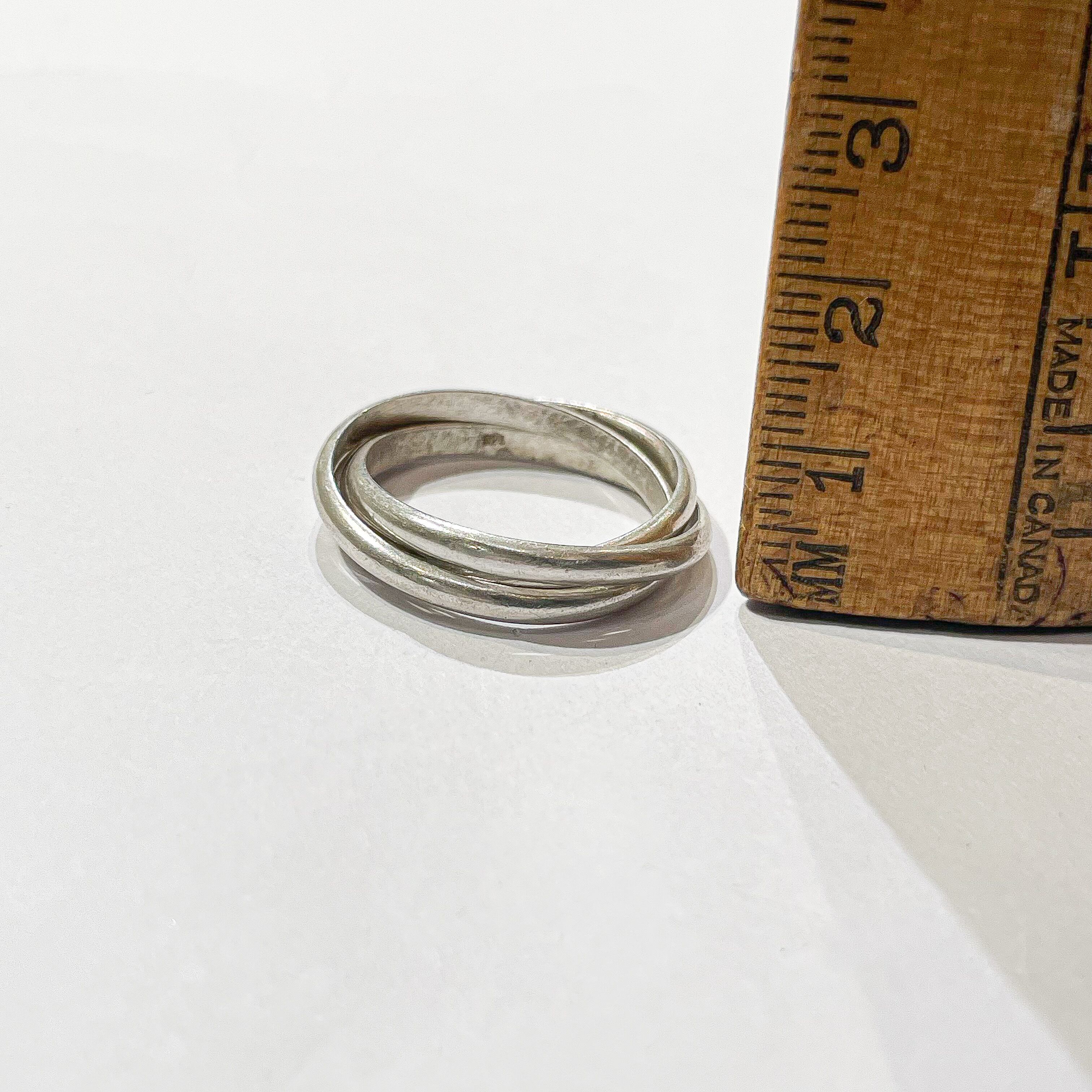 3つのリングが連なった925シルバーのオールドリングです。 シンプルなデザインで非常に使い勝手がよく男女問わずオススメです。 裏に925との刻印がございます。 推定80's以降のお品です。 Weight*約3.5g Size*約20号 Condition*特に目立つダメージや汚れはなく良い状態です。 あくまでUSEDですので神経質な方や新品の様なものをお求めの方はご購入をお控え下さいませ。